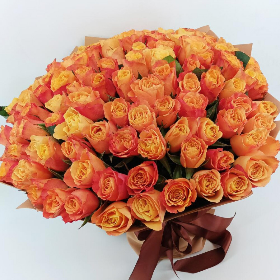 На фото букет из 101 оранжевой розы. В составе: роза 101 шт, крафт-бумага 2 шт, атласная лента 2 шт, . Все цветы свежие и ароматные, букет красиво оформлен и отлично подходит для подарка. Доступна доставка цветов или самовывоз.