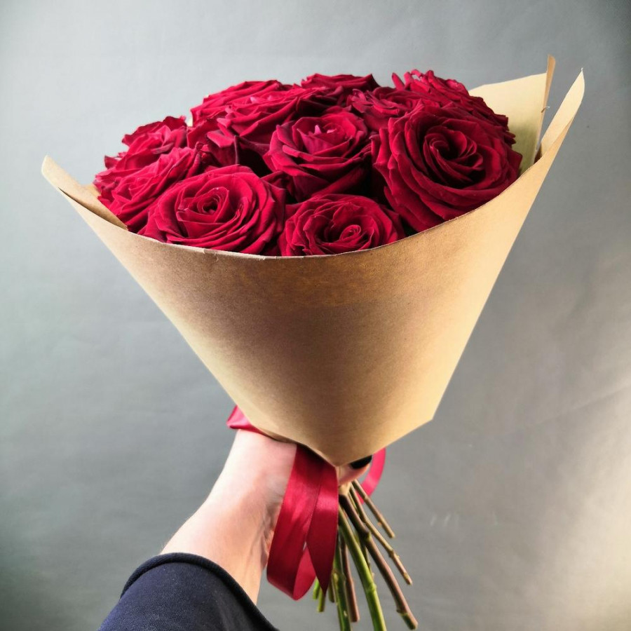На фото букет из 13 бордовых роз. В составе: роза 13 шт, крафт-бумага 1 шт, атласная лента 1 шт, . Все цветы свежие и ароматные, букет красиво оформлен и отлично подходит для подарка. Доступна доставка цветов или самовывоз.