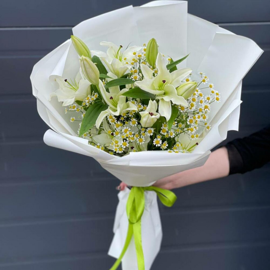 На фото букет «молочный шепот». В составе: лилия 3 шт, танацетум 5 шт, дизайнерская упаковка 1 шт, атласная лента 1 шт, . Все цветы свежие и ароматные, букет красиво оформлен и отлично подходит для подарка. Доступна доставка цветов или самовывоз.