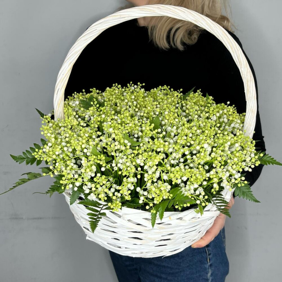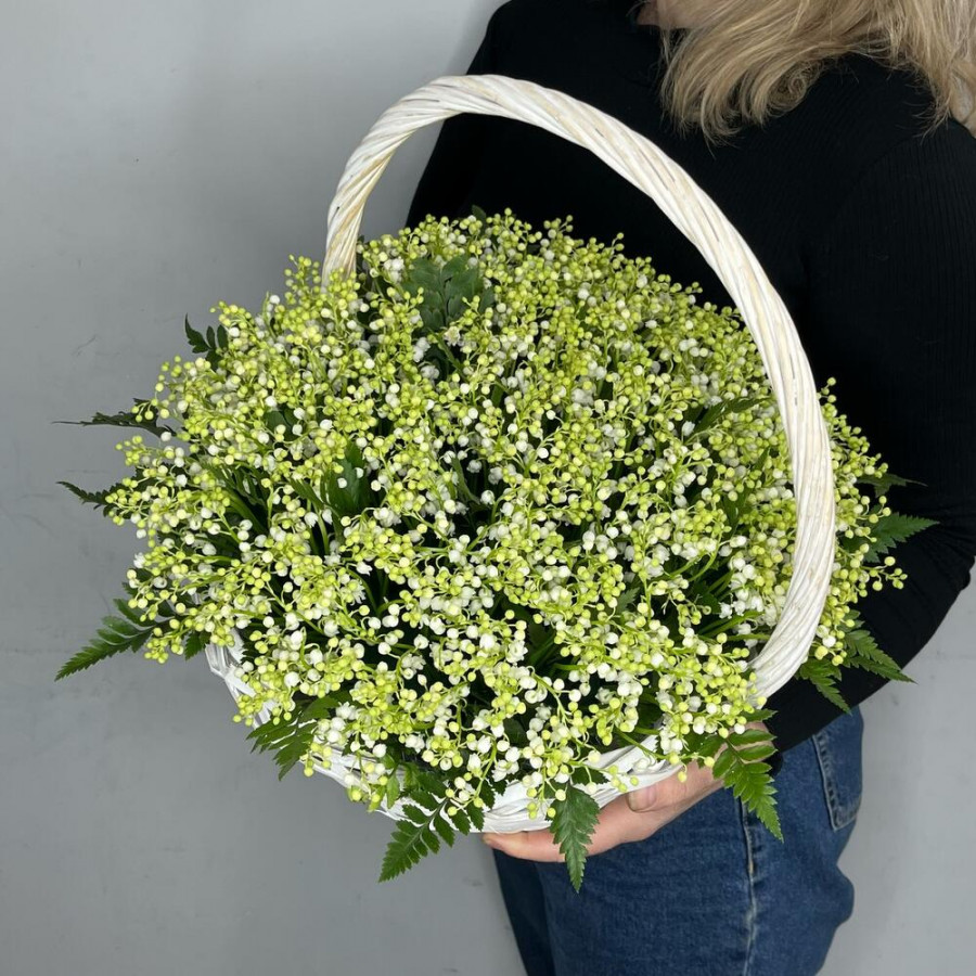 На фото корзина ландышей xl. В составе: ландыш 55 шт, оазис флористический 3 шт, корзина (xl) 1 шт, атласная лента 1 шт, . Все цветы свежие и ароматные, букет красиво оформлен и отлично подходит для подарка. Доступна доставка цветов или самовывоз.